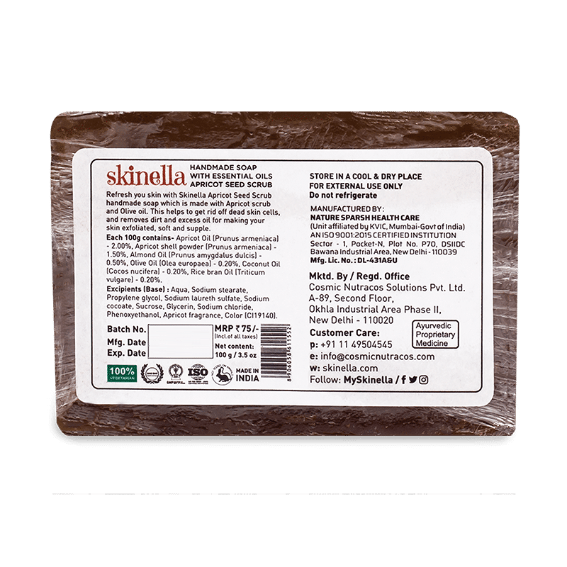 Skinella’s Apricot Seed Scrub Soap has been crafted for daily usage. Wet it slightly in water and use it on your arms, legs, back, stomach, shoulders, and neck while showering. For best results, use it morning and night.
