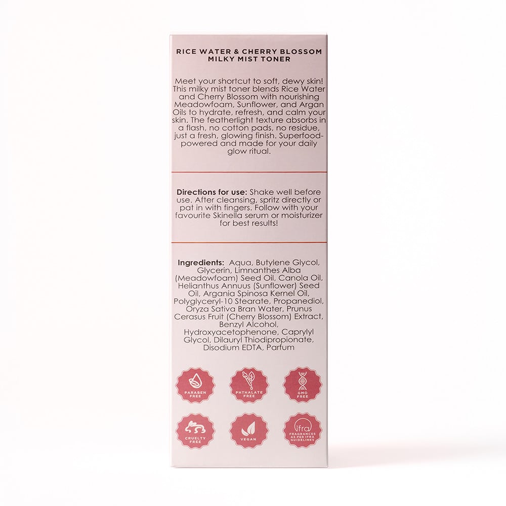 This milky mist toner blends Rice Water and Cherry Blossom with nourishing oils to hydrate, refresh, and calm your skin. The featherlight texture absorbs in a flash, no cotton pads, no fuss—just a fresh, glowing finish. Superfood-powered for your daily glow ritual.
