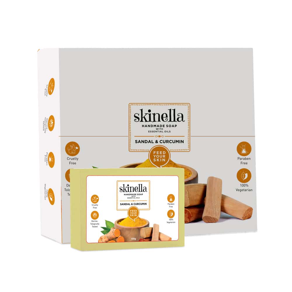 Skinella’s Sandal & Curcumin Soap has been crafted for daily usage. Wet it slightly in water and use it on your arms, legs, back, stomach, shoulders, and neck while showering. For best results, use it morning and night.